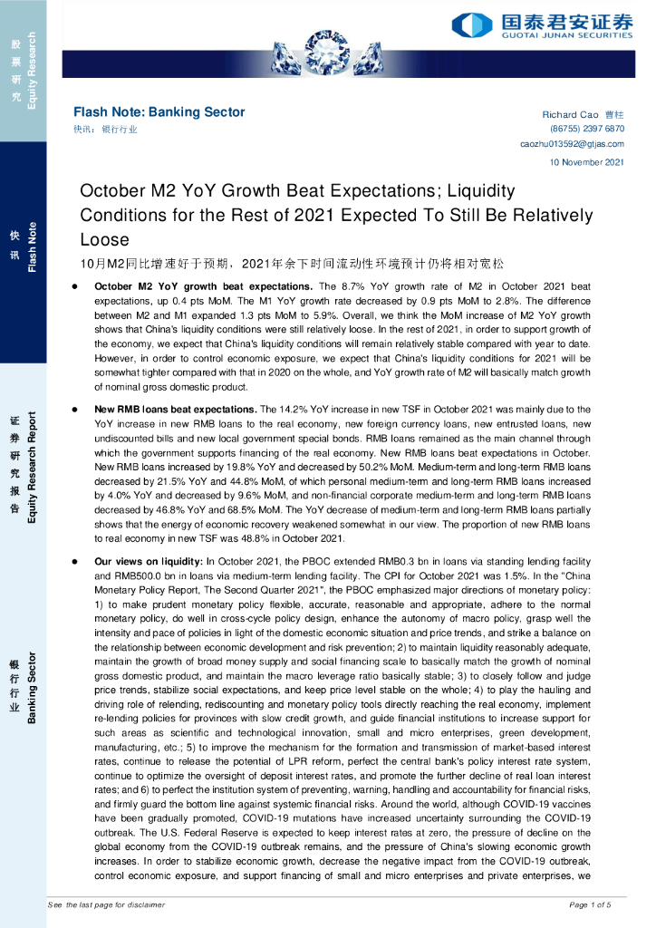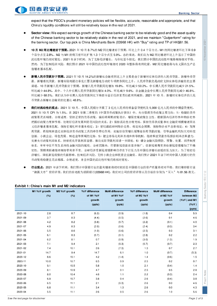 国泰君安证券(香港):银行行业:10月M2同比增速好于预期,2021年余下时间流动性环境预计仍将相对宽松.pdf