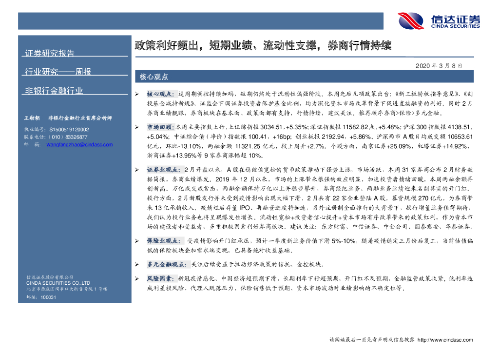 信达证券:非银行金融行业周报:政策利好频出,短期业绩、流动性支撑,券商行情持续.pdf