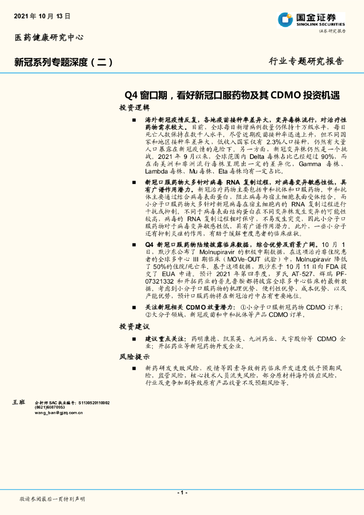 国金证券:医药健康行业新冠系列专题深度(二):Q4窗口期,看好新冠口服药物及其CDMO投资机遇.pdf