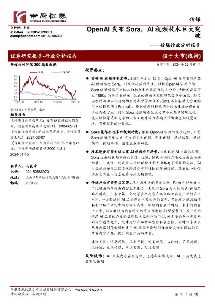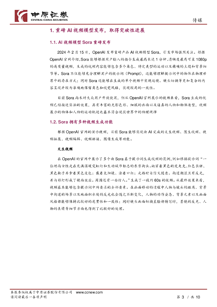 中原证券:传媒行业分析报告:OpenAI发布Sora,AI视频技术巨大突破.pdf