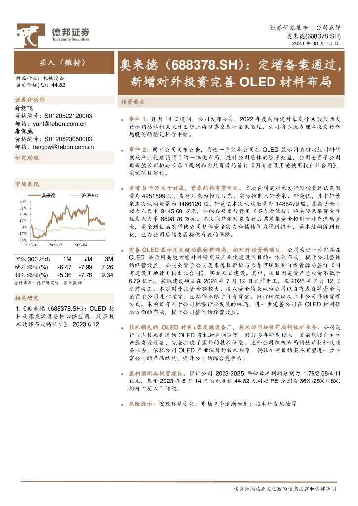 德邦证券:奥来德(688378)-定增备案通过,新增对外投资完善OLED材料布局.pdf