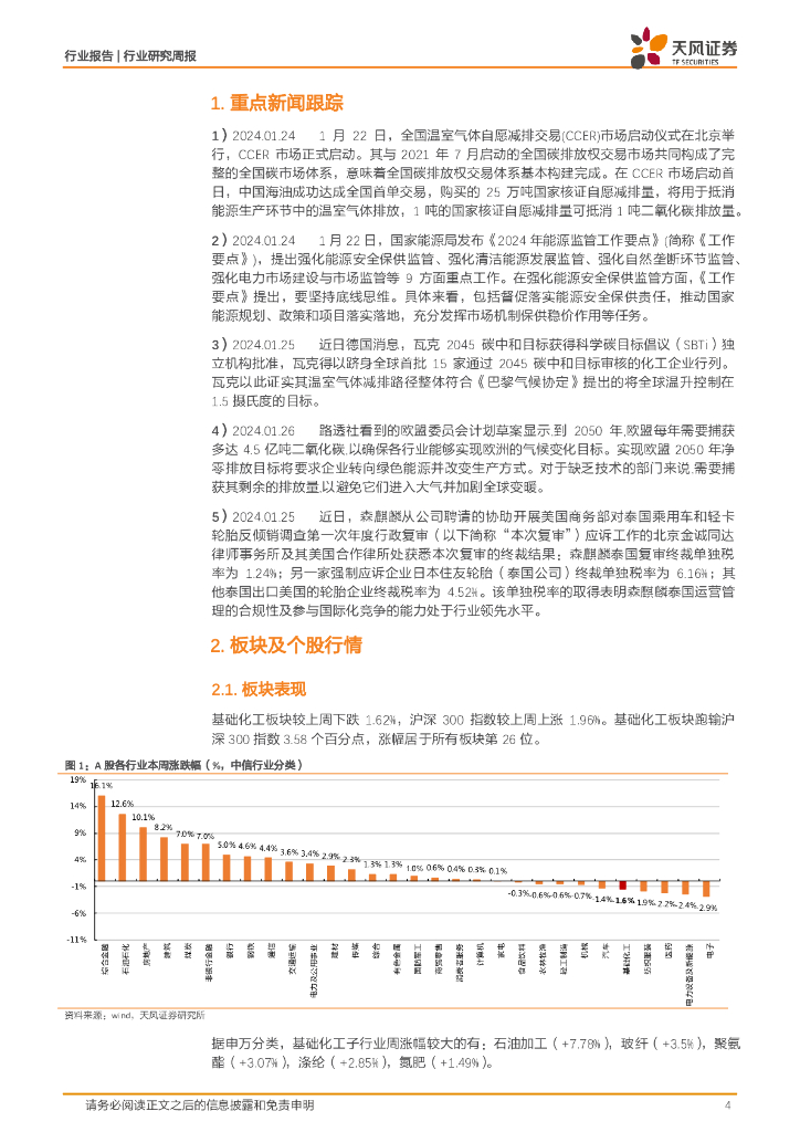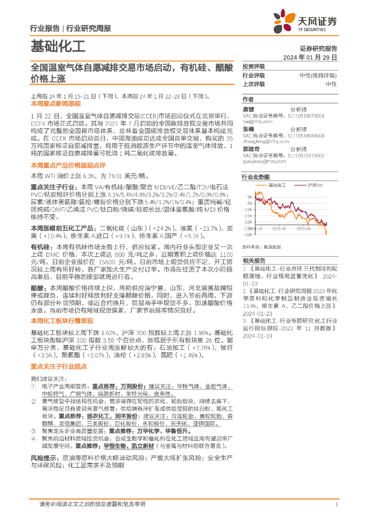 天风证券:基础化工行业周报:全国温室气体自愿减排交易市场启动,有机硅、醋酸价格上涨.pdf