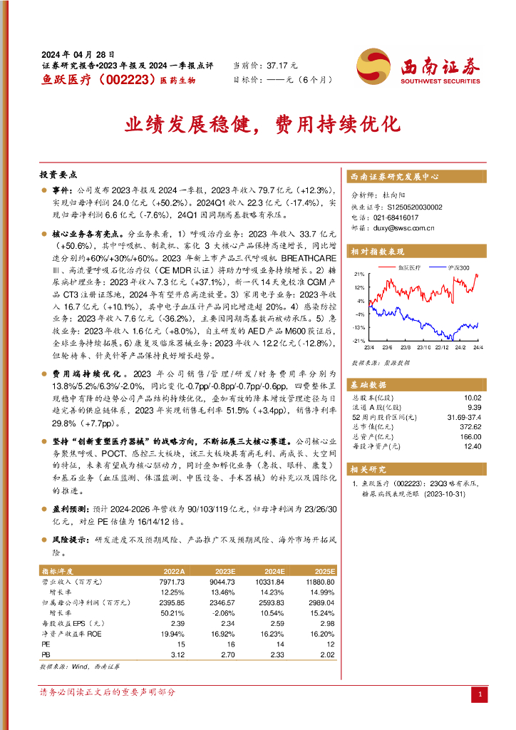 西南证券:鱼跃医疗(002223)-业绩发展稳健,费用持续优化.pdf