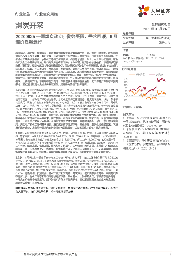 天风证券:煤炭开采行业一周煤炭动向:供给受限,需求回暖,9月煤价强势运行.pdf