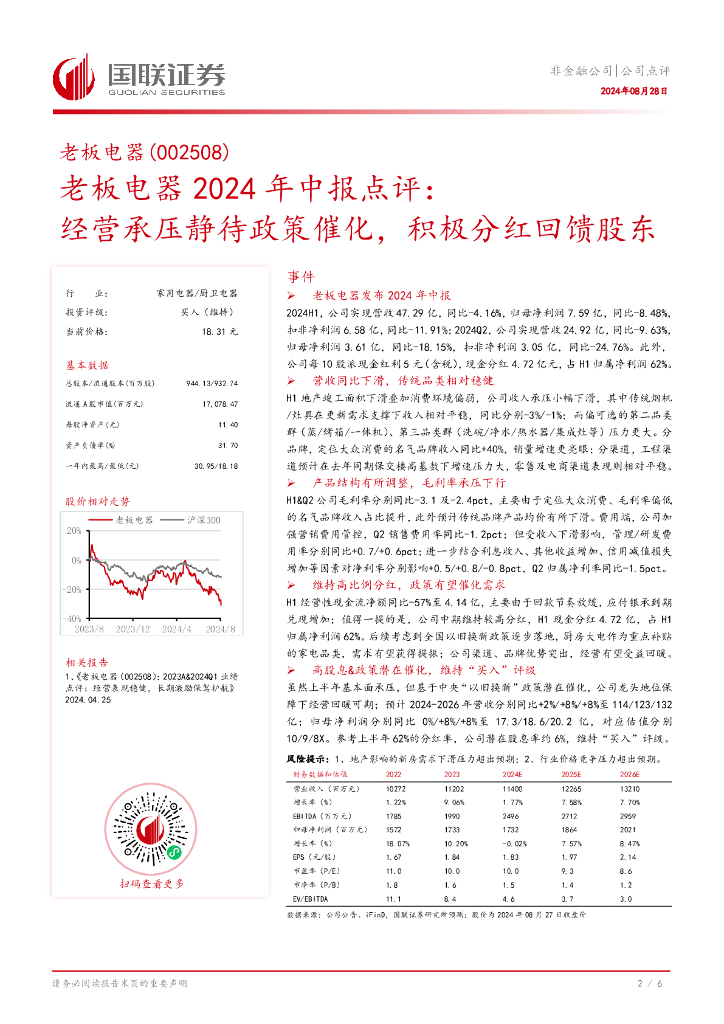 国联证券:老板电器2024年中报点评:经营承压静待政策催化,积极分红回馈股东.pdf