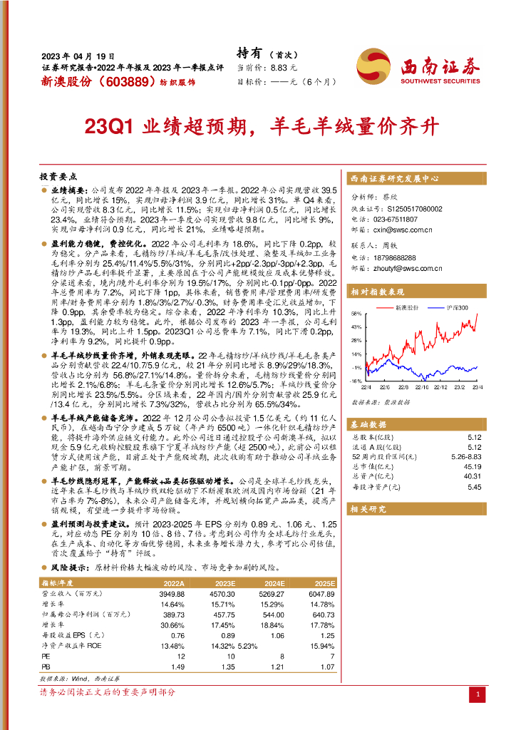 西南证券:新澳股份(603889)-23Q1业绩超预期,羊毛羊绒量价齐升.pdf