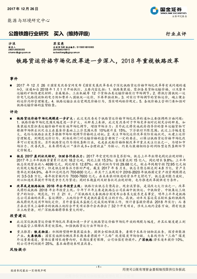 国金证券:公路铁路行业研究:铁路货运价格市场化改革进一步深入,2018年重视铁路改革.pdf