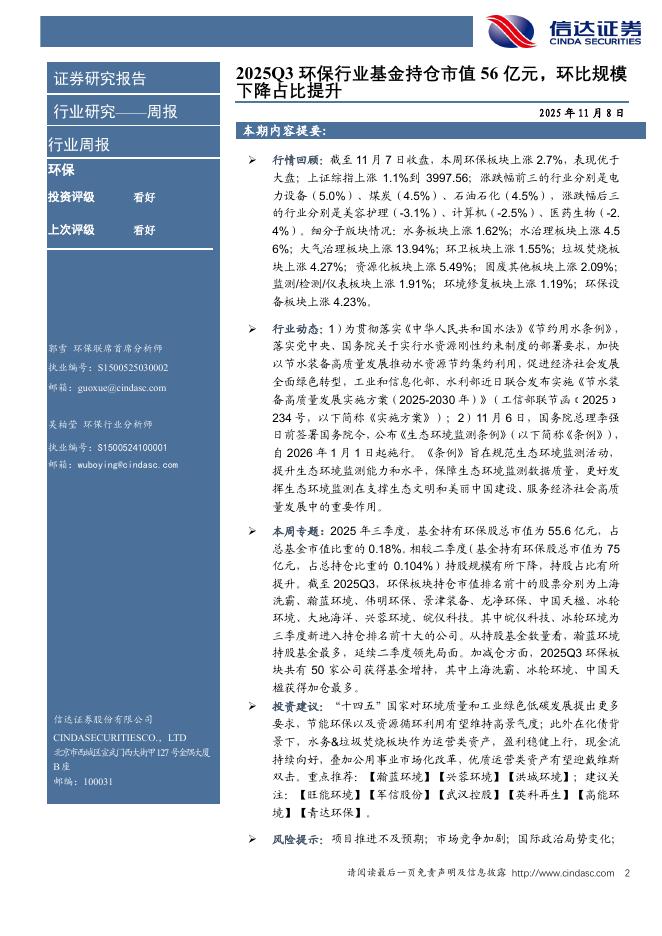 信达证券:环保行业周报:2025Q3环保行业基金持仓市值56亿元,环比规模下降占比提升.pdf