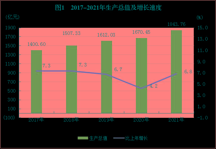 初步核算,全市生产总值1843.76亿元,比上年增长6.8%。其中,第一产业增加值239.51亿元,增长6.8%;第二产业增加值657.09亿元,增长5.6%;第三产业增加值947.16亿元,增长7.4%。三次产业增加值比例为13.0:35.6:51.4。全市人均生产总值58774元,比上年增长6.6%。