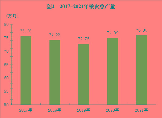 全市粮食作物播种面积129672公顷,比上年增加1106公顷。粮食总产量759976吨,增加10098吨,增长1.4%。其中,夏粮总产量90654吨,增长8.6%;秋粮总产量669322吨,增长0.4%。