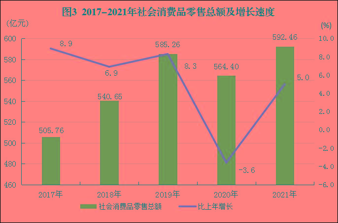 全年社会消费品零售总额592.46亿元,比上年增长5.0%。城镇消费品零售额475.16亿元,增长5.9%;乡村消费品零售额117.30亿元,增长1.5%。
