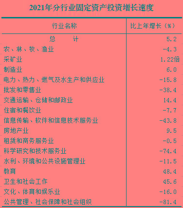 全年固定资产投资(不含农户)比上年增长5.2%。其中,建设项目投资增长1.6%;房地产开发投资增长12.0%。分产业看,第一产业投资下降4.0%;第二产业投资增长3.1%,其中工业投资增长2.9%,工业技改投资增长1.3%;第三产业投资增长6.5%,其中交通、运输仓储和邮政业投资增长14.4%,教育、卫生和社会工作分别增长48.4%和45.6%。