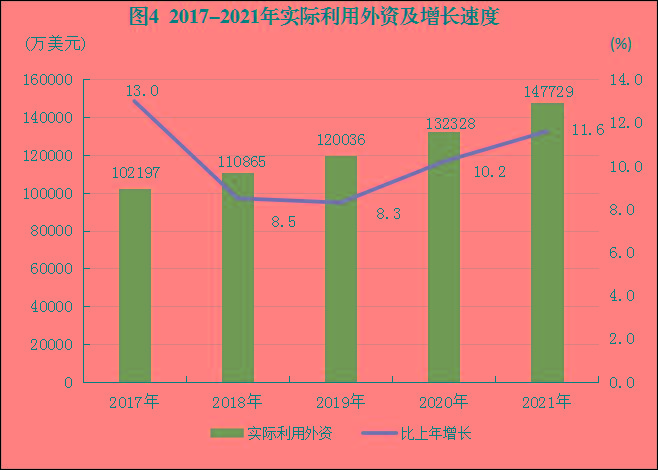 全年进出口总额401.11亿元,比上年增长11.7%。其中,出口额235.45亿元,增长13.9%;进口额165.65亿元,增长8.7%。实际利用外资14.77亿美元,增长11.6%;批准外资合同项目8个,合同外资额1.34亿美元。