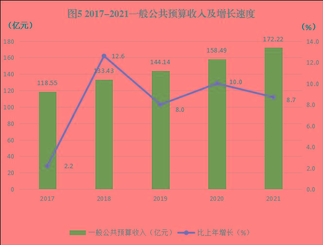 全年全部财政收入303.51亿元,比上年增长8.5%;一般公共预算收入172.22亿元,增长8.7%,其中,税收收入107.51亿元,增长8.0%。全部财政支出401.49亿元,下降21.6%,其中一般公共预算支出309.56亿元,下降9.0%。