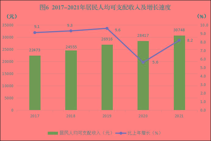 全年全市居民人均可支配收入30748元,比上年增长8.2%。城镇居民人均可支配收入42567元,增长6.6%;农村居民人均可支配收入17793元,增长10.6%。居民年人均消费支出21277元,增长8.6%。城镇居民人均消费支出27413元,增长5.6%;农村居民人均消费支出14551元,增长13.9%。居民恩格尔系数为29.3%,比上年下降1.0个百分点。