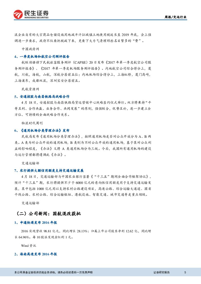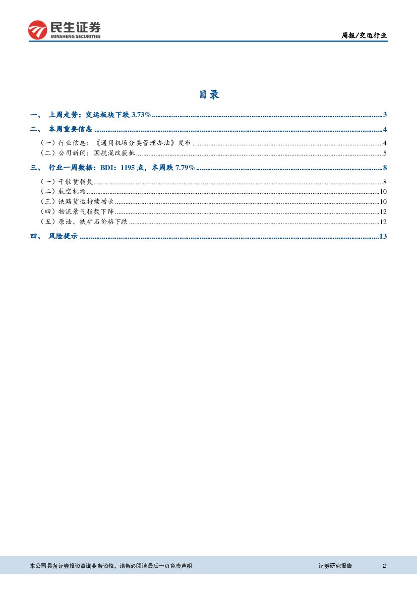 民生证券:交运行业周报:国航航空货运物流混改获批复,民航改革提速.pdf