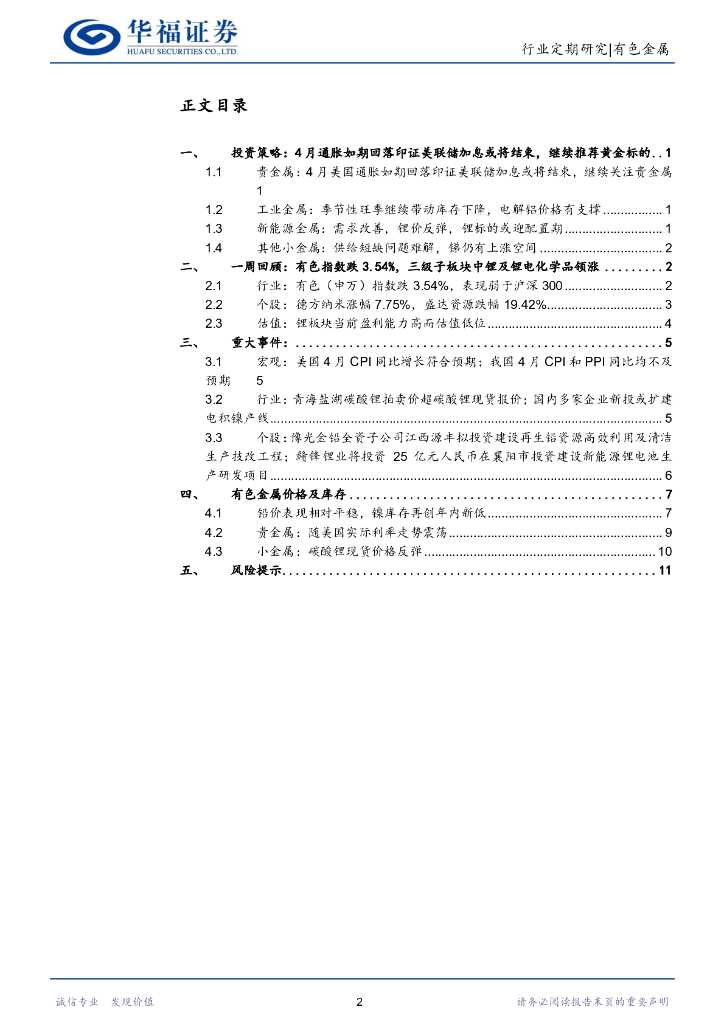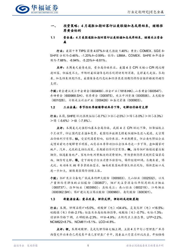 华福证券:有色金属行业周报:4月通胀如期回落印证美联储加息或将结束,继续推荐黄金标的.pdf