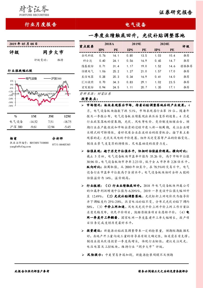 财富证券:电气设备行业月度报告:一季度业绩触底回升,光伏补贴调整落地.pdf
