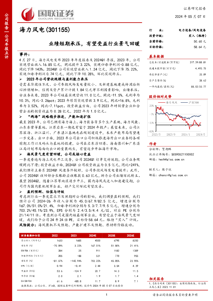 国联证券:海力风电(301155)-业绩短期承压,有望受益行业景气回暖.pdf