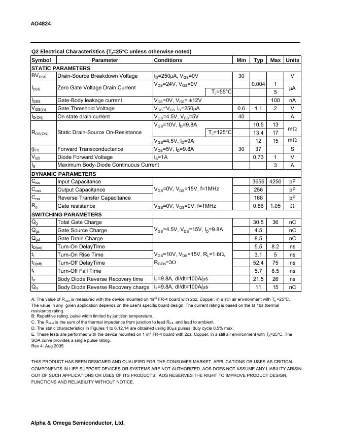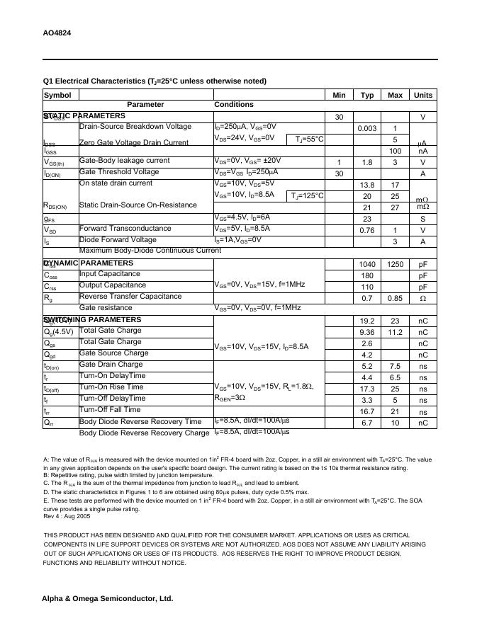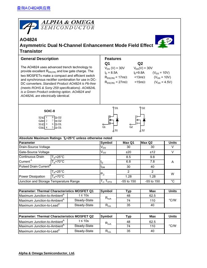 ALPHA&OMEGA AO4824 Asymmetric Dual N-Channel Enhancement Mode Field Effect Transistor 数据手册.pdf