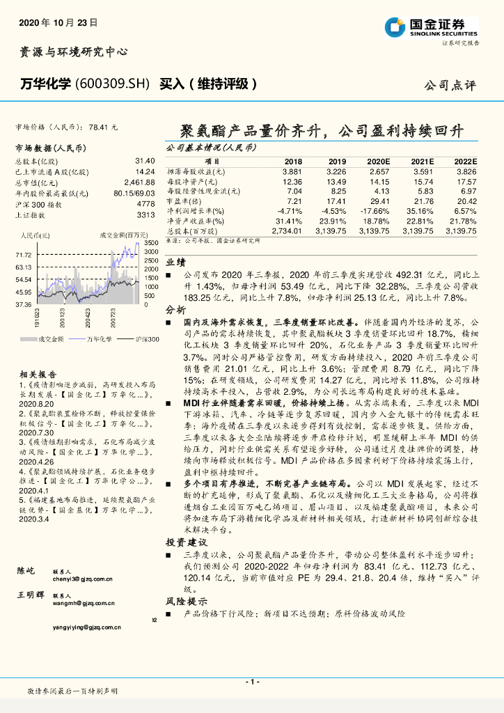国金证券:万华化学(600309)-聚氨酯产品量价齐升,公司盈利持续回升.pdf
