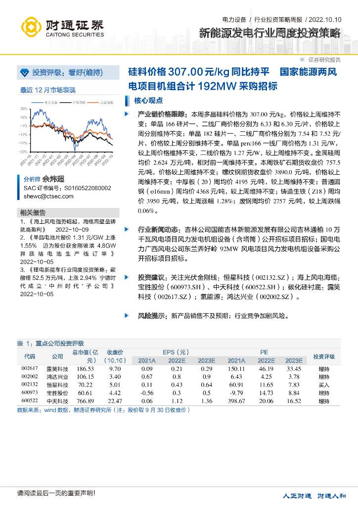 财通证券:新能源发电行业周度投资策略:硅料价格307.00元/kg同比持平 国家能源两风电项目机组合计192MW采购招标.pdf
