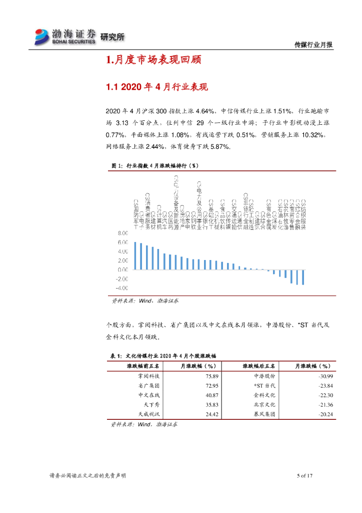 渤海证券:传媒行业月报:4月行业表现一般,精选一季报业绩良好的龙头.pdf