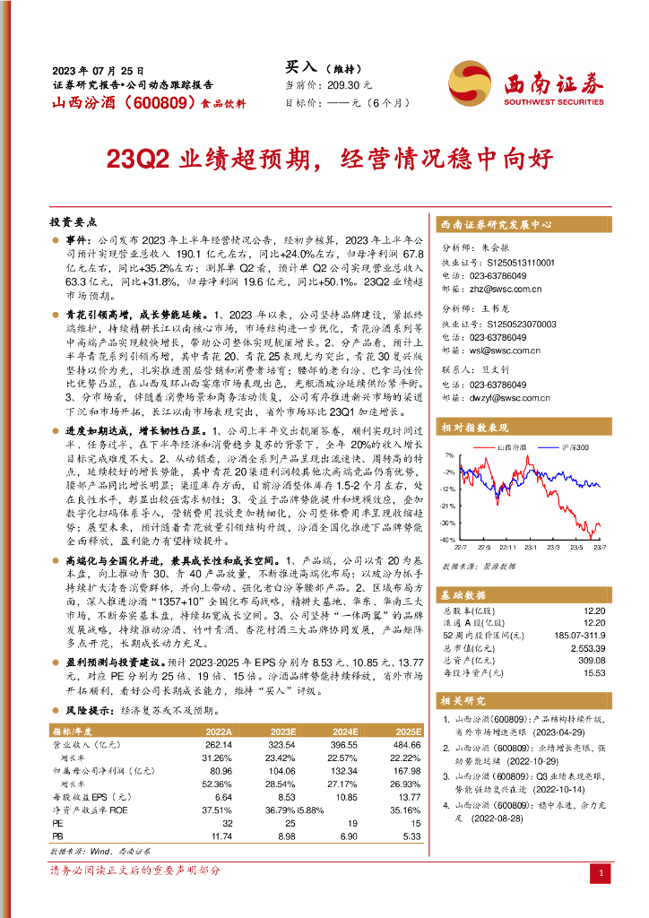 西南证券:山西汾酒(600809)-23Q2业绩超预期,经营情况稳中向好.pdf