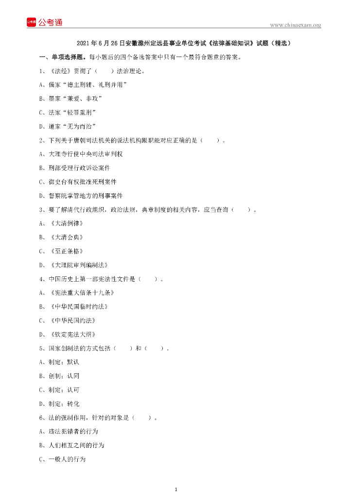 2021年6月26日安徽滁州定远县事业单位考试《法律基础知识》试题(精选).pdf