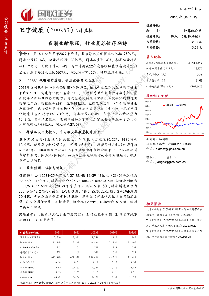 国联证券:卫宁健康(300253)-当期业绩承压,行业复苏值得期待.pdf