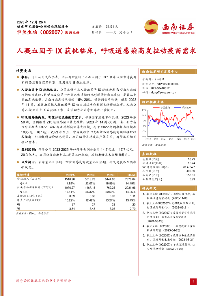 西南证券:华兰生物(002007)-人凝血因子IX获批临床,呼吸道感染高发拉动疫苗需求.pdf
