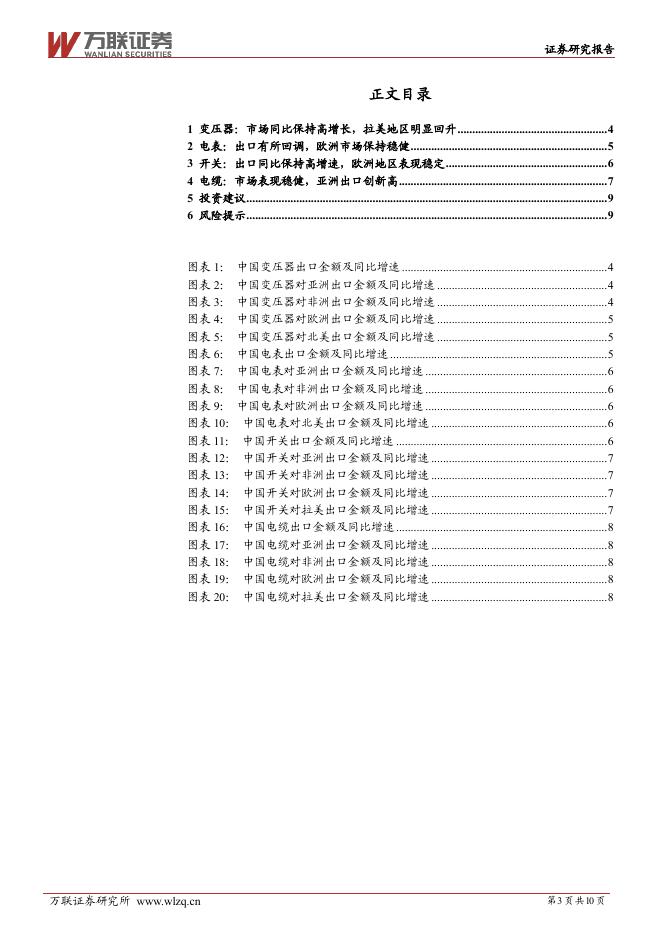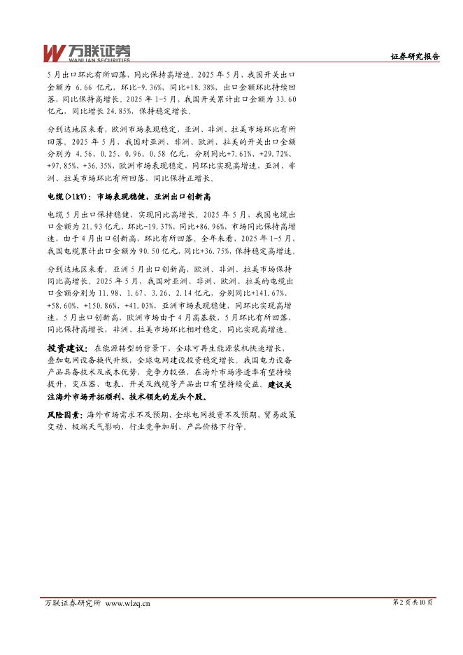 万联证券:电力设备行业跟踪报告:电力设备出口:变压器、开关市场表现稳定,电缆出口持续高增长.pdf