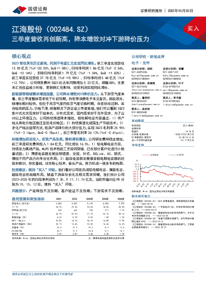 国信证券:江海股份(002484)-三季度营收再创新高,降本增效对冲下游降价压力.pdf