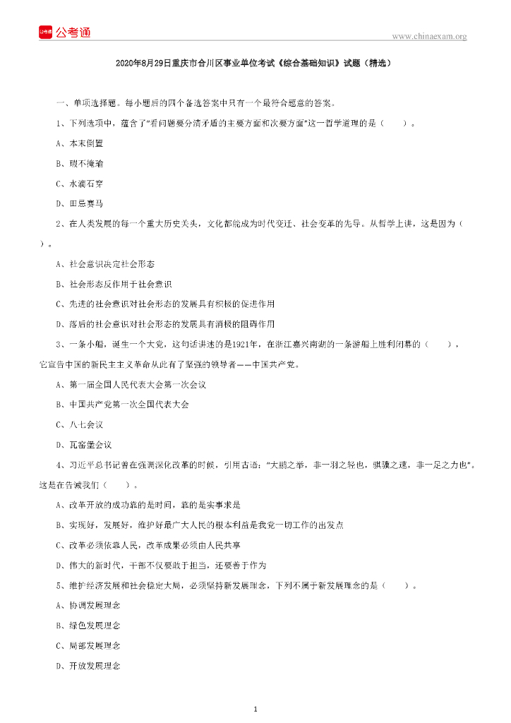 2020年8月29日重庆市合川区事业单位考试《综合基础知识》试题.pdf