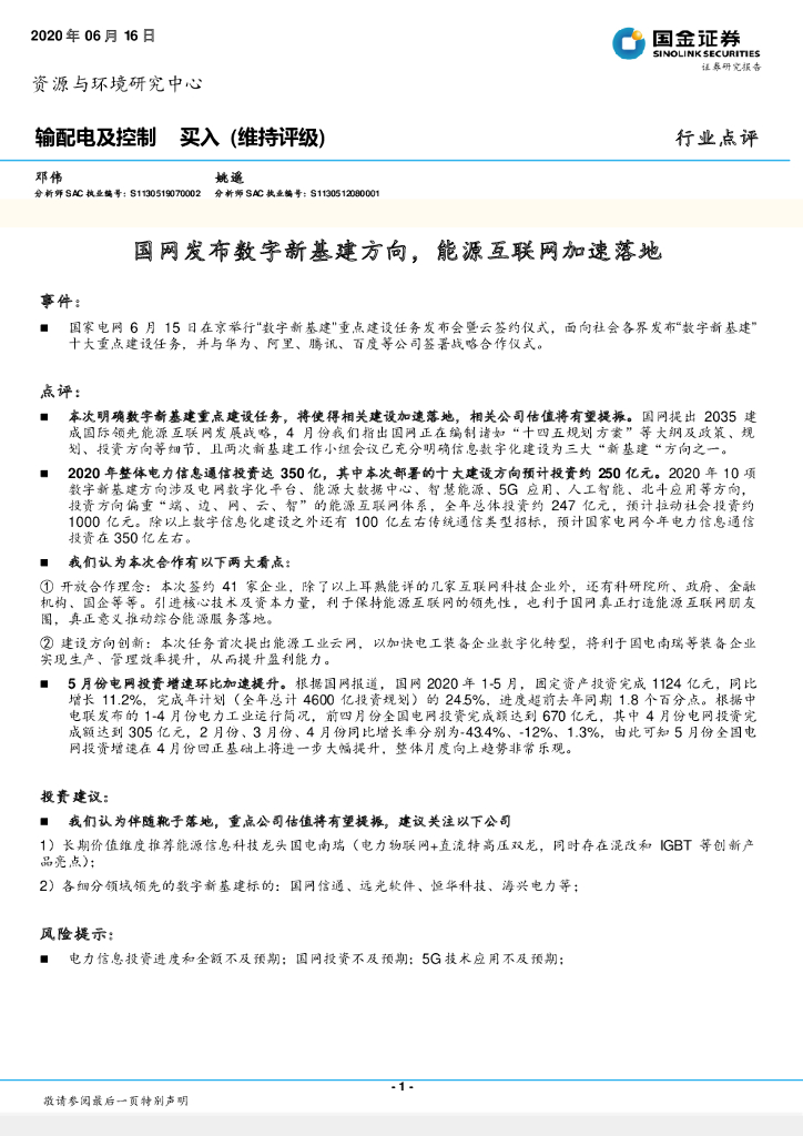 国金证券:输配电及控制:国网发布数字新基建方向,能源互联网加速落地.pdf