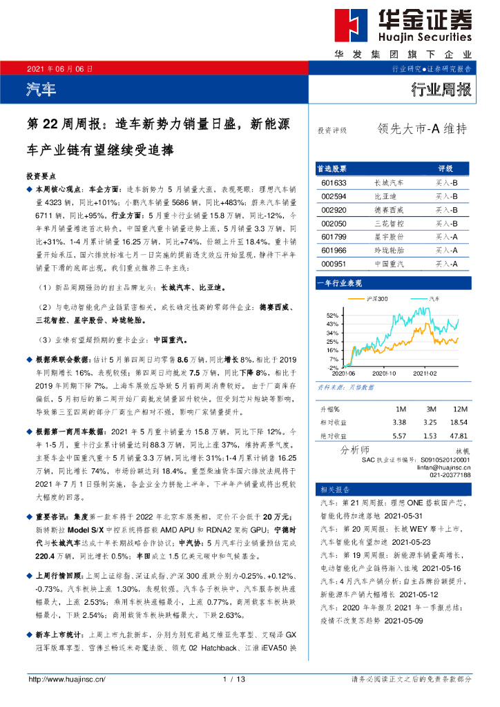 华金证券:汽车行业第22周周报:造车新势力销量日盛,新能源车产业链有望继续受追捧.pdf