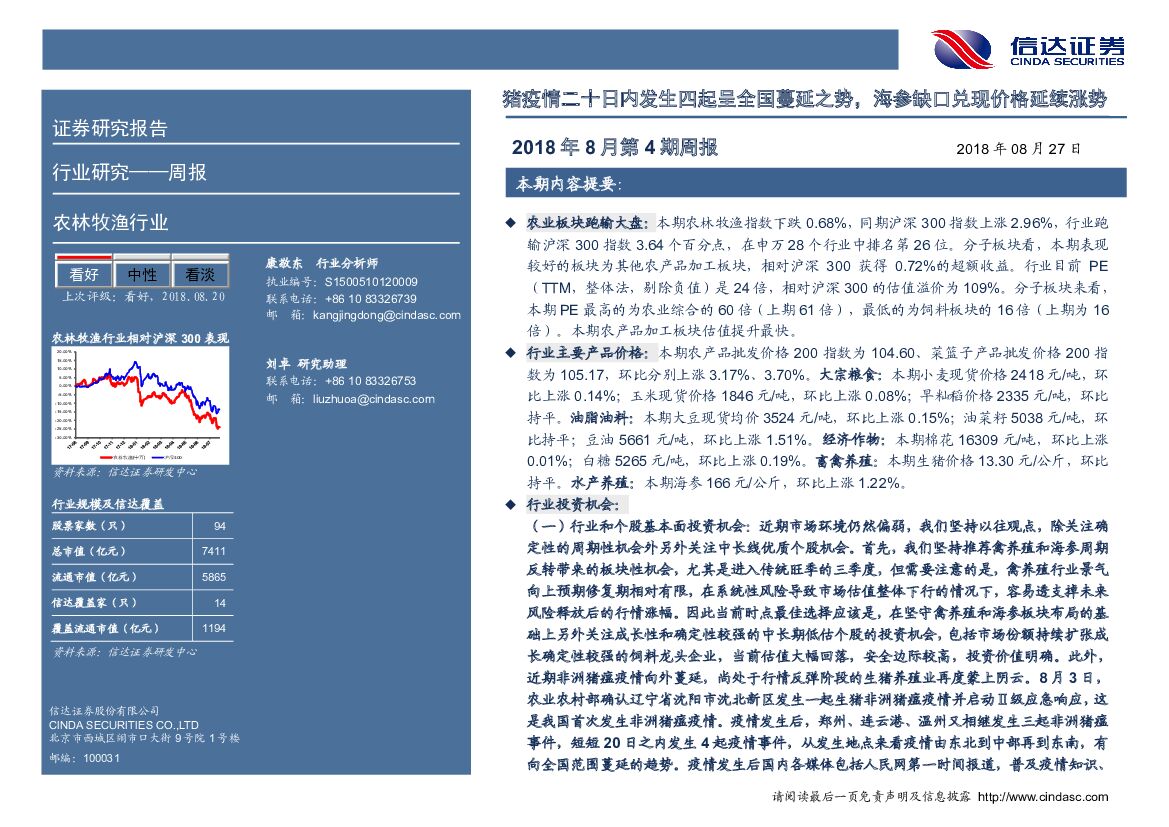 信达证券:农林牧渔2018年8月第4期周报:猪疫情二十日内发生四起呈全国蔓延之势,海参缺口兑现价格延续涨势.pdf