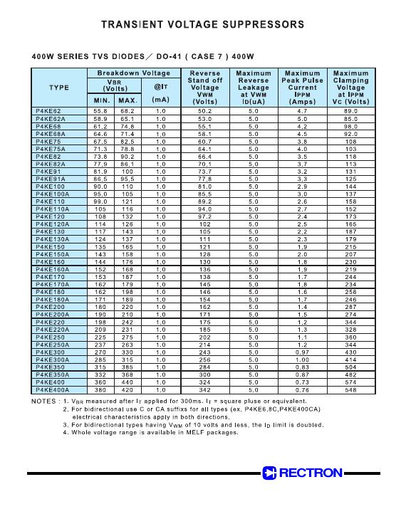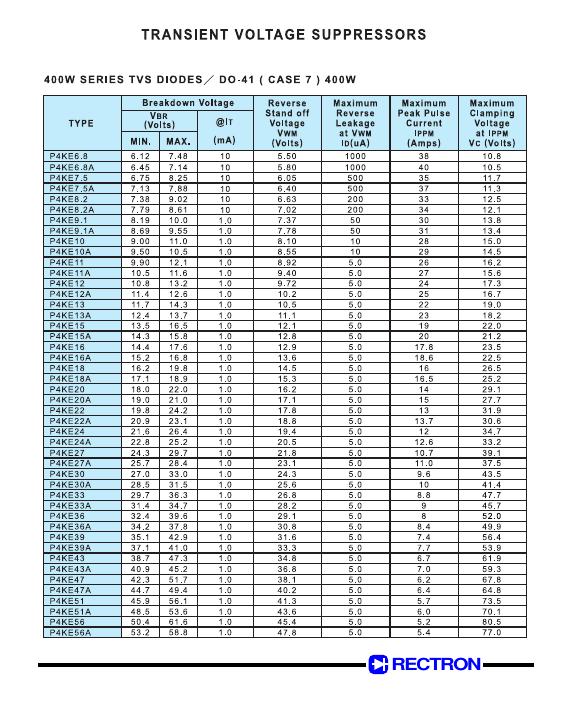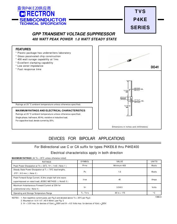 RECTRON SEMICONDUCTOR TECHNICAL SPECIFICATION TVS P4KE SERIES 数据手册.pdf