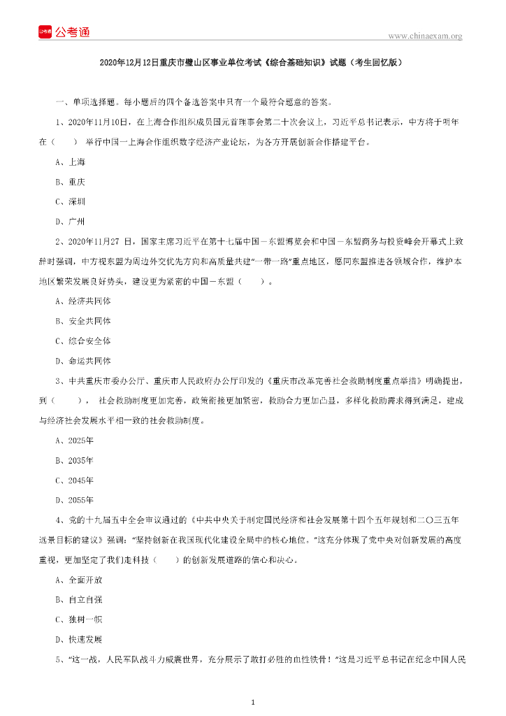 2020年12月12日重庆市璧山区事业单位考试《综合基础知识》试题.pdf