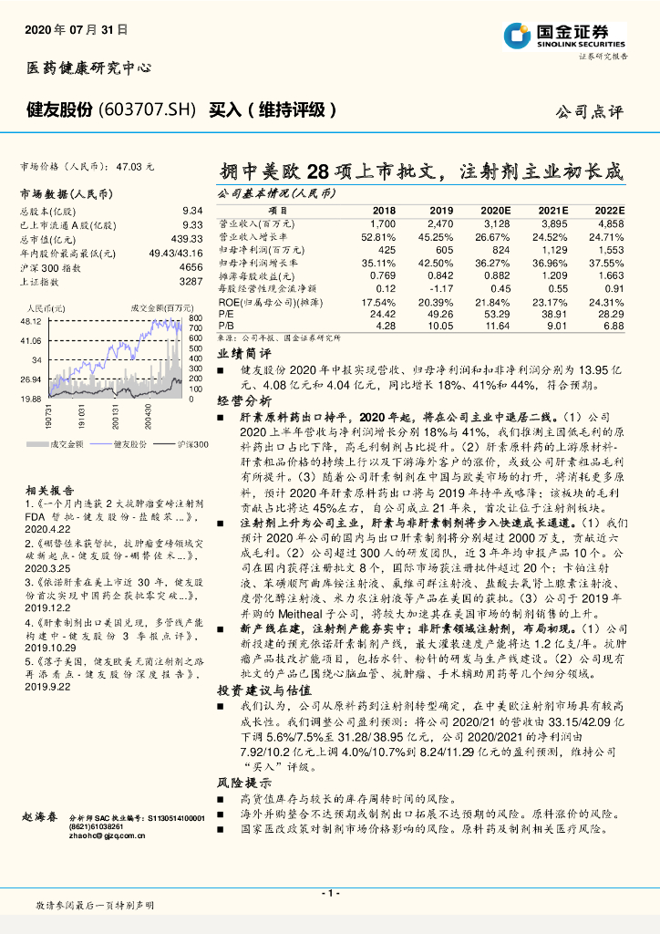 国金证券:健友股份(603707)-拥中美欧28项上市批文,注射剂主业初长成.pdf