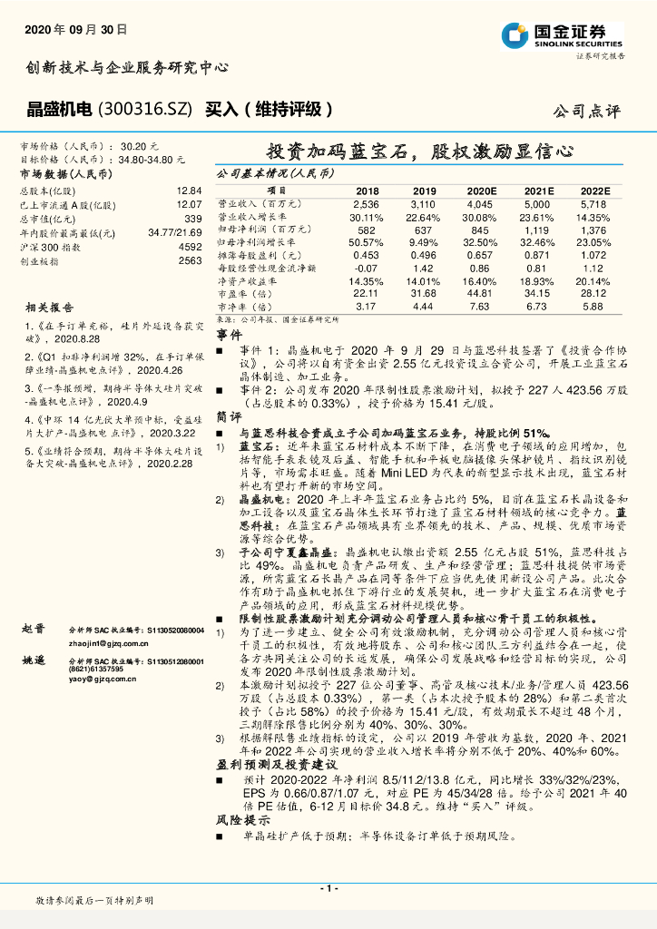 国金证券:晶盛机电(300316)-投资加码蓝宝石,股权激励显信心.pdf