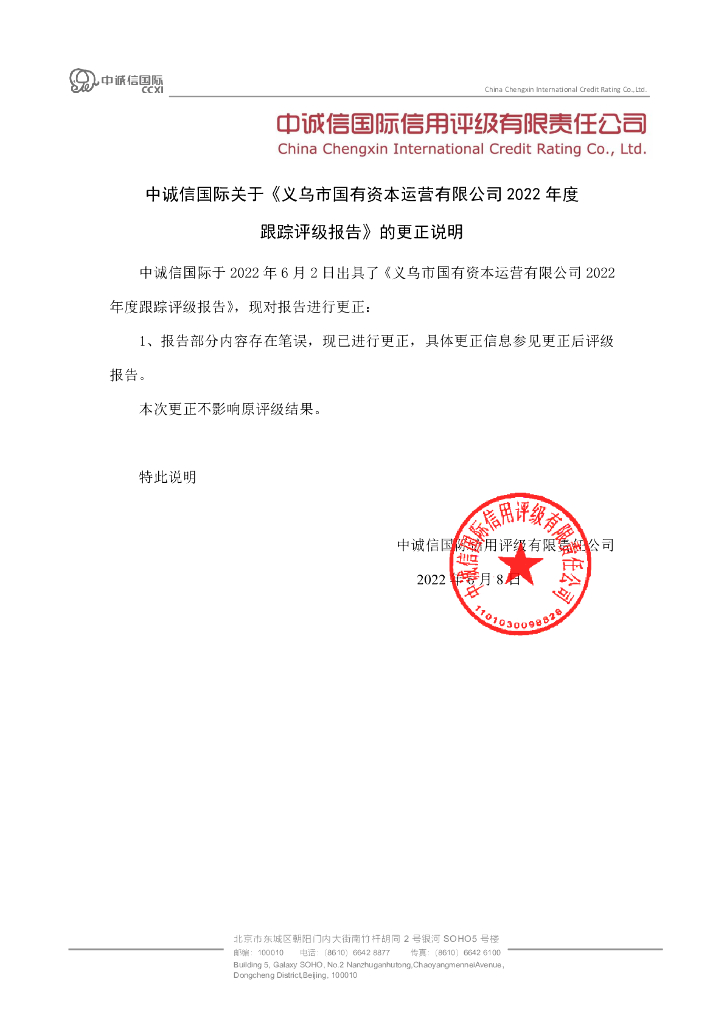 中诚信:义乌市国有资本运营有限公司2022年度跟踪评级报告的更正说明及更正后文件.pdf