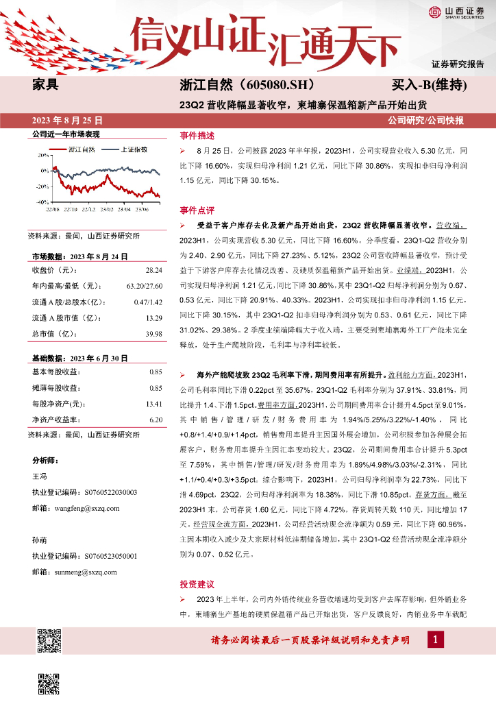 山西证券:浙江自然(605080)-23Q2营收降幅显著收窄,柬埔寨保温箱新产品开始出货.pdf