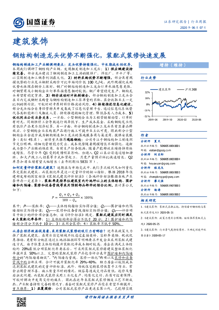国盛证券:建筑装饰行业周报:钢结构制造龙头优势不断强化,装配式装修快速发展.pdf