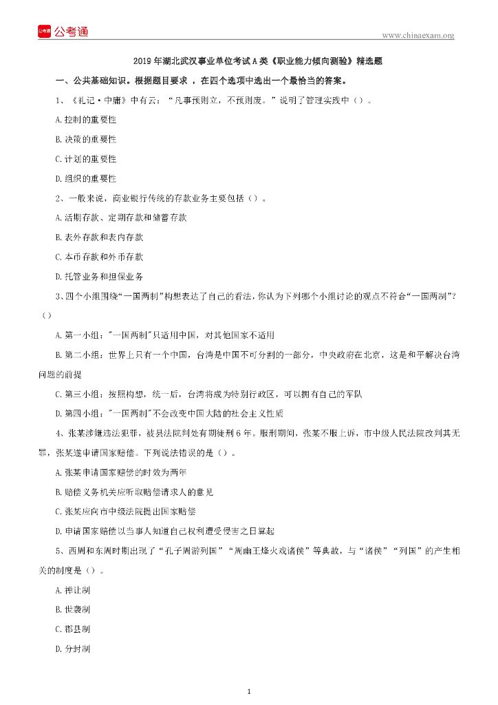 2019年湖北武汉事业单位考试A类《职业能力倾向测验》精选题.pdf