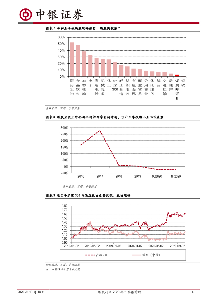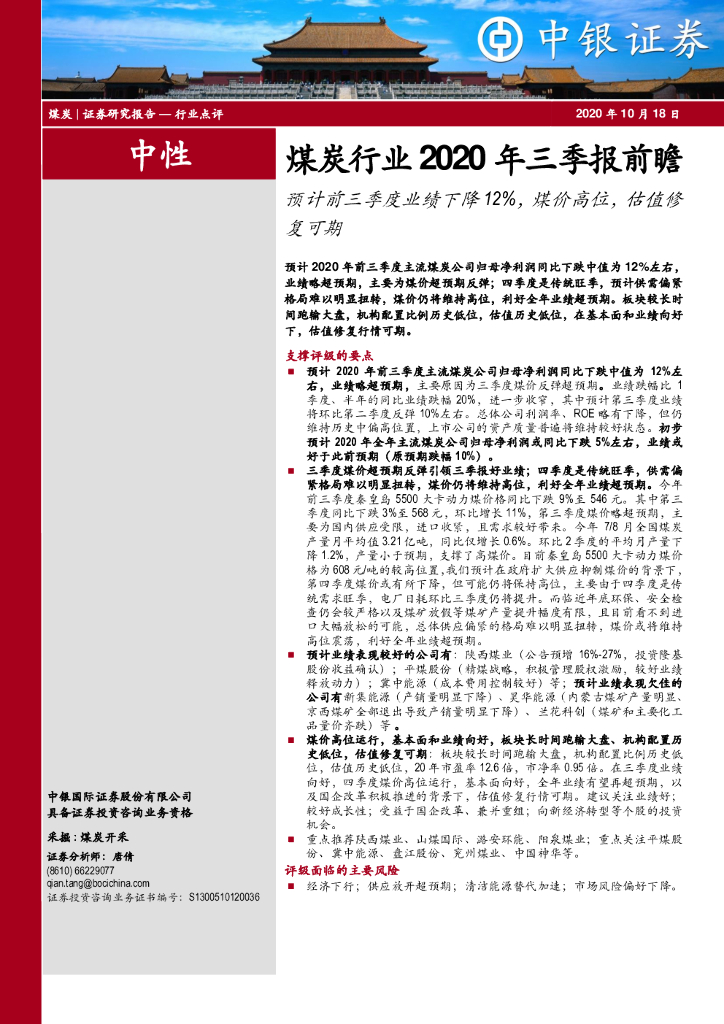 中银证券:煤炭行业2020年三季报前瞻:预计前三季度业绩下降12%,煤价高位,估值修复可期.pdf