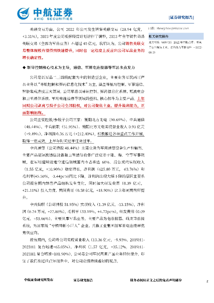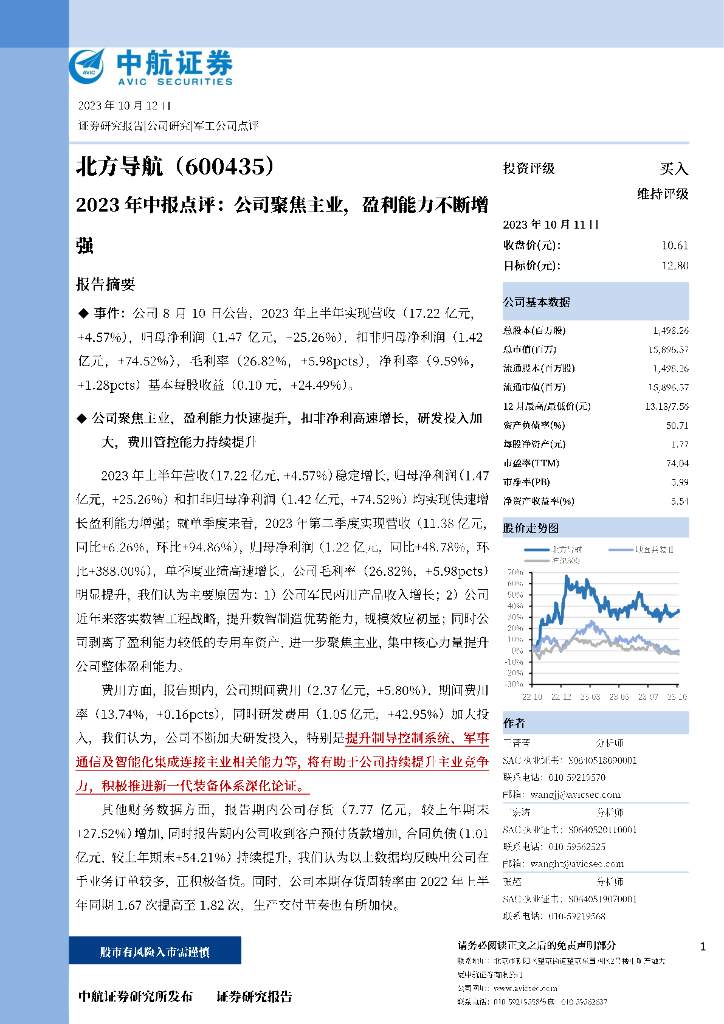 中航证券:北方导航(600435)-2023年中报点评:公司聚焦主业,盈利能力不断增强.pdf