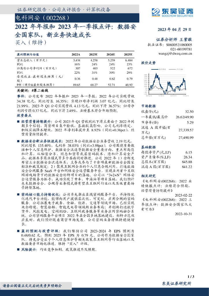 东吴证券:电科网安(002268)-2022年年报和2023年一季报点评:数据安全国家队,新业务快速成长.pdf