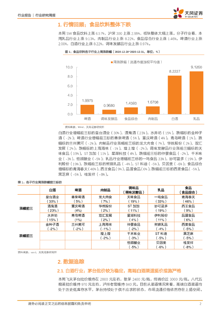 天风证券:食品饮料行业研究周报:白酒Q1业绩弹性叠加中长期乐观预期,乳制品受奶价上涨影响或加速集中.pdf