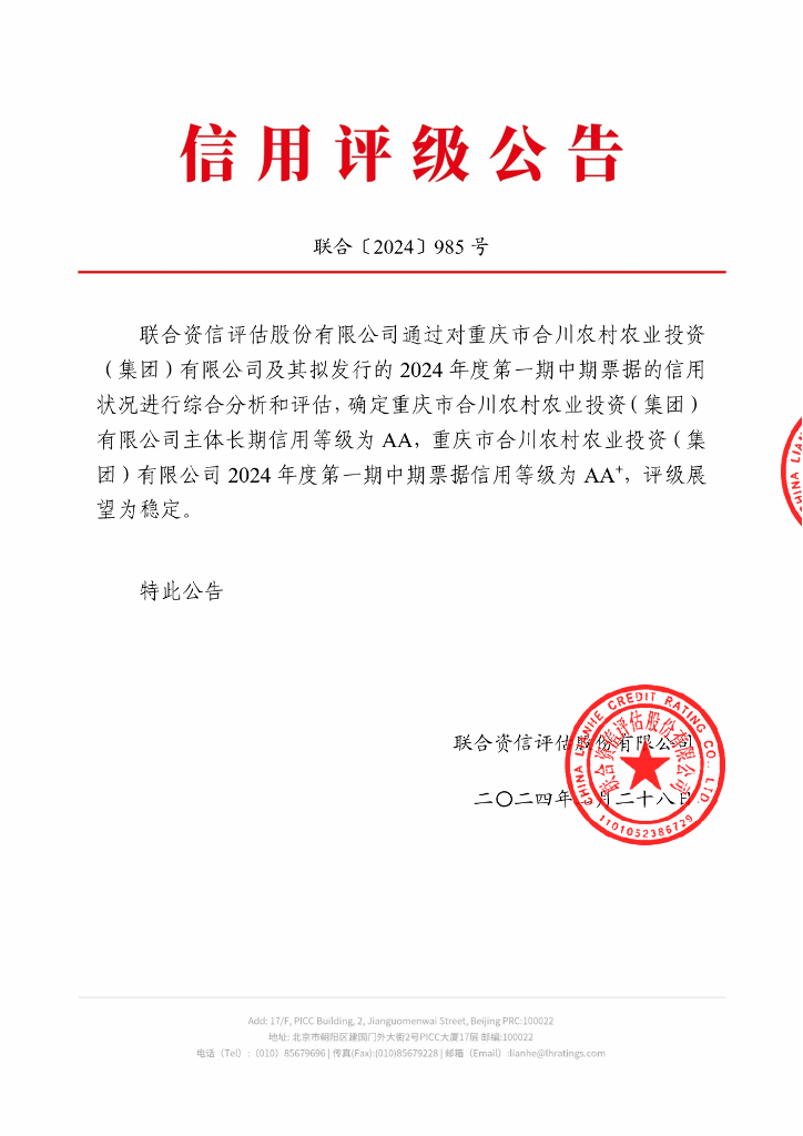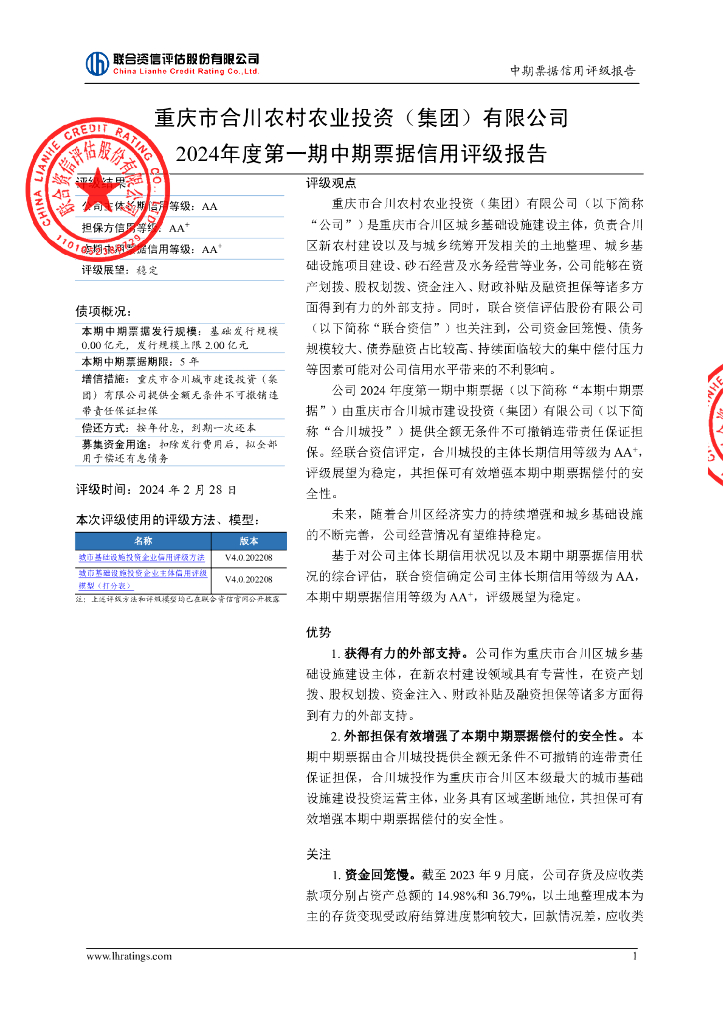 联合资信:重庆市合川农村农业投资(集团)有限公司2024年度第一期中期票据信用评级报告.pdf